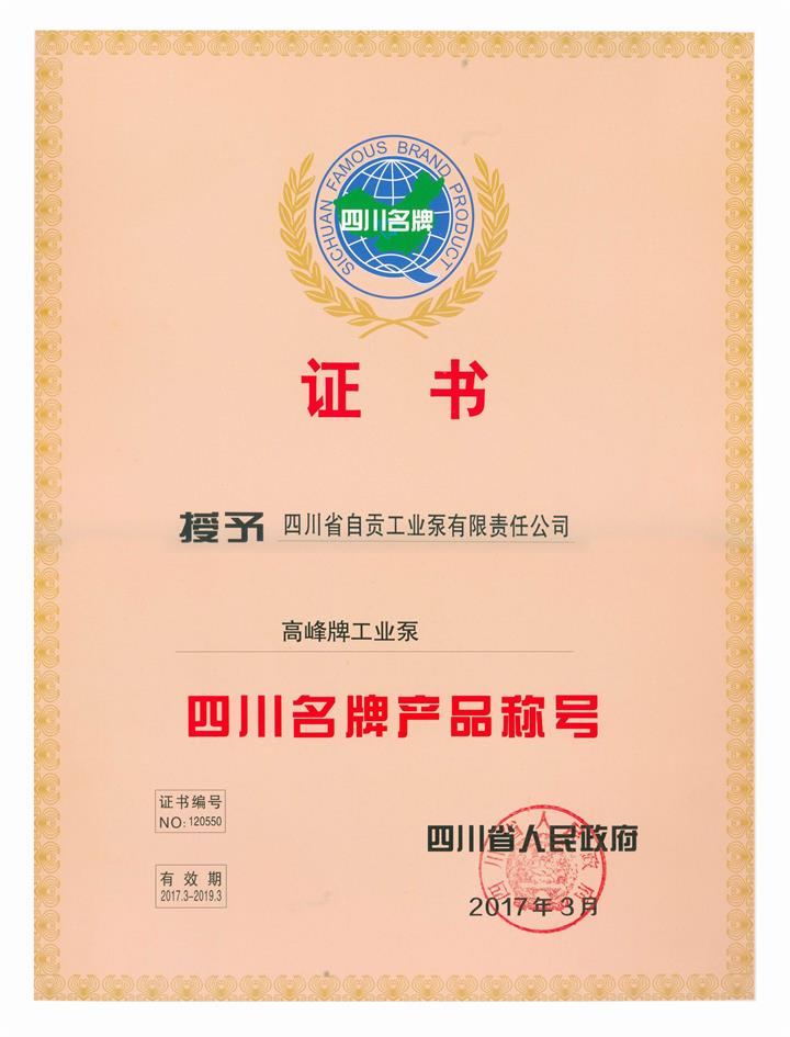 日前,我公司收到四川省人民政府頒發(fā)的《四川名牌證書》,公司高峰牌工業(yè)泵被授予第十二屆“四川名牌產(chǎn)品”稱號。據(jù)悉,公司產(chǎn)品是繼2014年榮獲第十一屆“四川名牌產(chǎn)品”后,再次獲此殊榮。